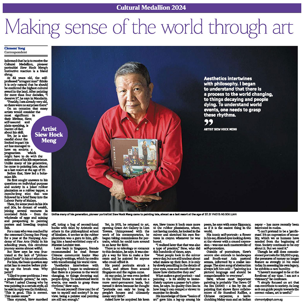 The Straits Times and Lianhe Zaobao featured Cultural Medallion awardee and Nanyang Academy of Fine Arts (NAFA) alumnus Siew Hock Meng, who was coached by the esteemed Cheong Soo Pieng.