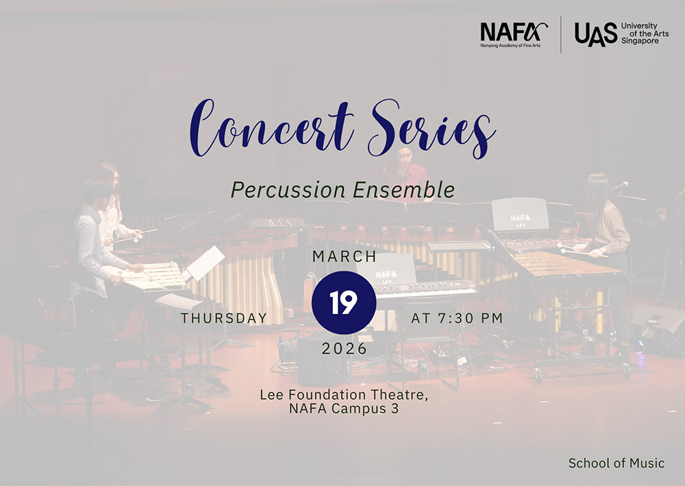 Under the direction of Head of Percussion Mark Suter, with Assistant Director Derek Koh, the NAFA Percussion Ensemble presents The Inexorable Motion of Time — a dynamic programme exploring rhythm, pulse, and the passage of time.