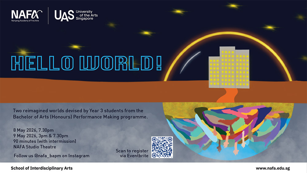 Hello World! is a double-bill showcase, utilising interdisciplinary research and practice, presented in two versions of an imagined future. From the fabric-choked shores of a repurposed Sentosa to the sterile oxygen-rationed domes of a Martian colony, Hello World! questions: If the world reboots tomorrow, would you have the courage to dream up a different reality despite adversity and resistance?