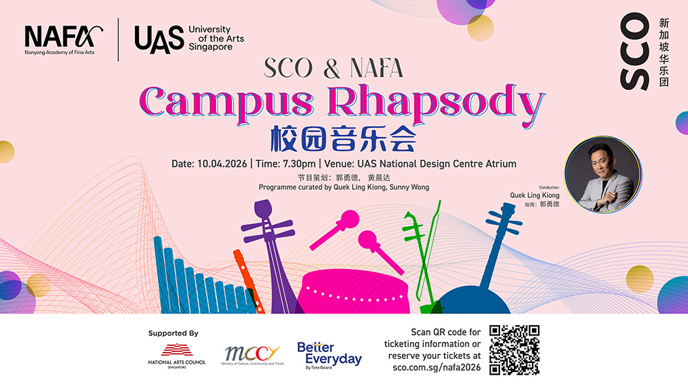 SCO x NAFA Campus Rhapsody returns this April, bringing together musicians of the Singapore Chinese Orchestra and outstanding NAFA students for an exciting evening of Chinese orchestral music.