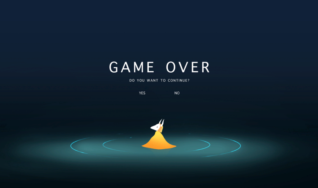 The game over screen shows the adventurer looking up sadly, urging the player to continue trying.