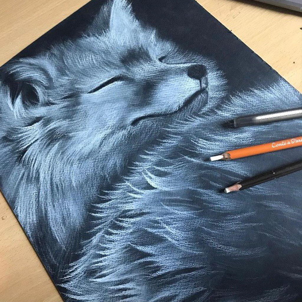 Pastel on canvas. White pastel to create the soft textures from the fur of a fox.
